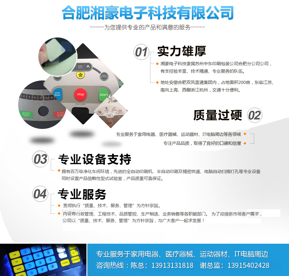 公司簡介 合肥湘豪電子科技有限公司系香港中意國際集團股份有限公司(1998年創(chuàng)建)下屬企業(yè),關系企業(yè)有:東莞中意塑膠制品有限公司(1996年創(chuàng)建),蘇州中意塑膠制品有限公司(2003年創(chuàng)建),蘇州中東包裝印刷有限公司(2007創(chuàng)建),蘇州捷瑞達自動化科技有限公司(2014年創(chuàng)建),東莞唯道實業(yè)有限公司(2014年創(chuàng)建),合肥六九機器人自動化科技有限公司(2015年創(chuàng)建);合作企業(yè)有:香港富通工業(yè)集團。 公司總部設在經(jīng)濟發(fā)達的香港,總公司這十幾年來先后在東莞,蘇州投資設廠,為滿足合肥市場廣大客戶的需求,總公司于2015年與香港富通工業(yè)集團合作在合肥投資設廠,打造電器控制面板,薄膜開關業(yè)界的航空母艦,創(chuàng)造專業(yè)產(chǎn)品,樹立精品觀念,鍛造高品質、高服務的企業(yè)形象,樹立正確的核心價值觀。全心全意為國內外品牌企業(yè)服...榮譽資質